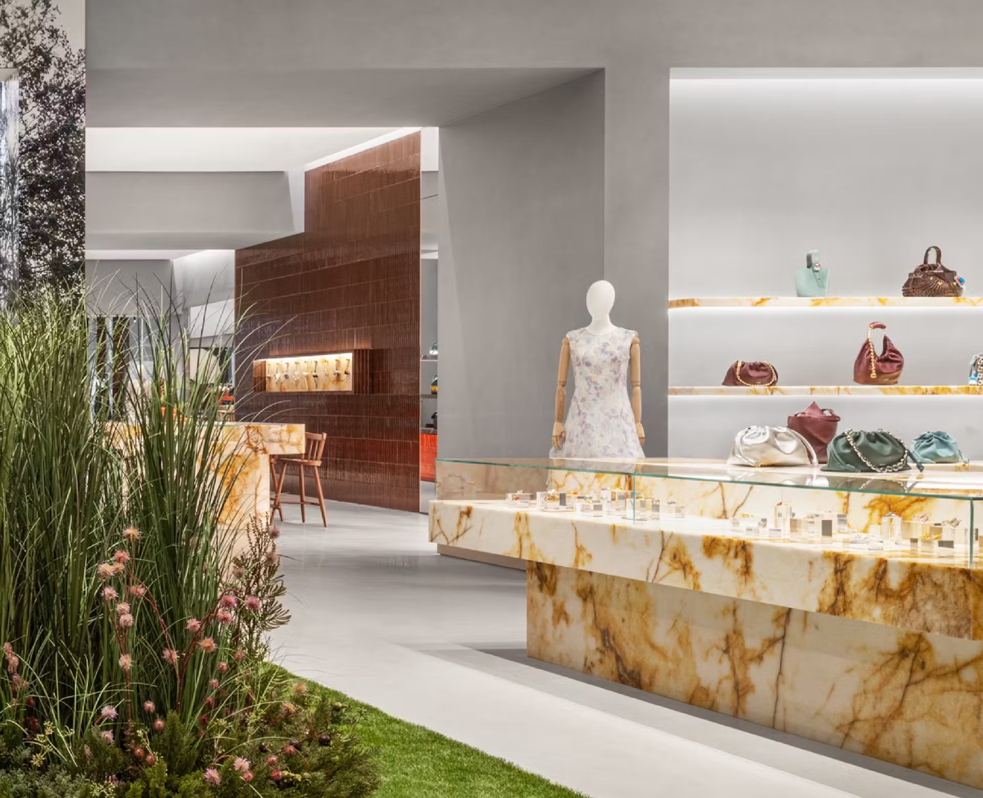 Inside, a color palette of white, brown, gold, orange and green complements materials such as marble, brass, glass and oak. Image credit: Loewe
