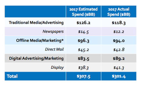 In every major category tracked by WinterberryGroup, such as newspaper advertising, direct mail and out-of-home, projected spending was routinely $2 or $3 billion more for 2017 than actual spend.