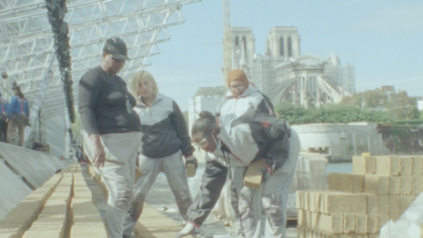 A large crate of bricks sits near the Seine River, where Chloé’s show took place. Close-up shots of the bricks being handed off one-by-one evoke a collaborative nature to the project and the overall mission of the collective.