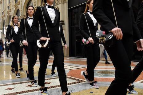 A parade of models dressed in tuxedos and Furla sneakers walked by the Duomo di Milano and through the Galleria Vittorio Emanuele II shopping arcade, with some breaking out into swing dance routines. Each of the models carried a 90th anniversary Metropolis handbag.
