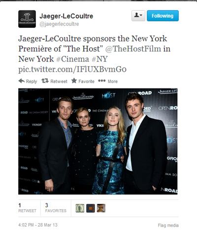 Swiss watchmaker Jaeger-LeCoultre is putting its brand in the Hollywood spotlight through its sponsorship at the New York premiere of “The Host” March 27.