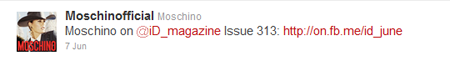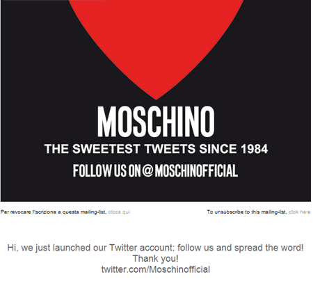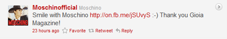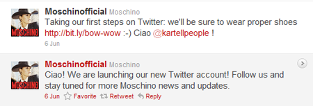 In an effort to bring together its global audience and promote a consistent message worldwide, Milan-based retailer Moschino launched an official Twitter account on June 8 - ages after its peers recognized the value of social media.