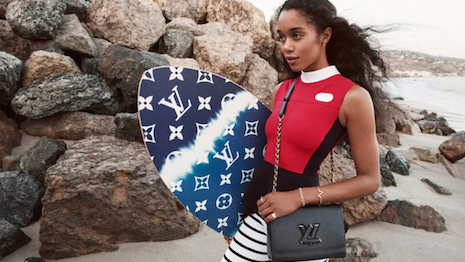 Laura Harrier carries the Louis Vuitton embossed skimboard down to the beaches of Malibu in the film campaign. Image credit: Louis Vuitton