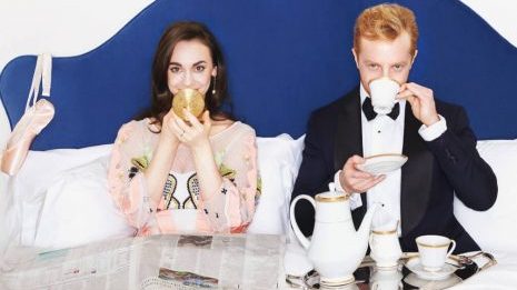 Wearing a tuxedo while under the covers, Mr. McRae drinks tea from a bone-china cup alongside Ms. Harrod, who powders her nose while she reads the Financial Times. The couple offer up sly smiles and a single pink ballet slipper is draped across the bed's blue backboard.